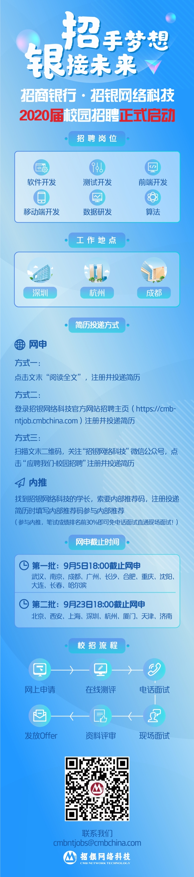 招商银行·招银网络科技提供软件开发、测试开发、前端开发、移动端开发、数据研发及算法等各个方向的职位,为2020届理工科类毕业生提供专业的发展平台,毕业生可以通过以下链接获取校招详情,进行注册简历://cmbntjob.cmbchina.com 。
