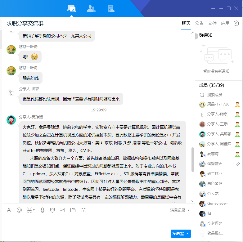 分享人在QQ群里分别介绍了关于后台开发、C++开发和机器学习等岗位的面试心得,还针对笔试和面试前的准备给出了建议。求职分享交流过程持续一个小时,支部成员和其他观众都获取到了大量干货。
