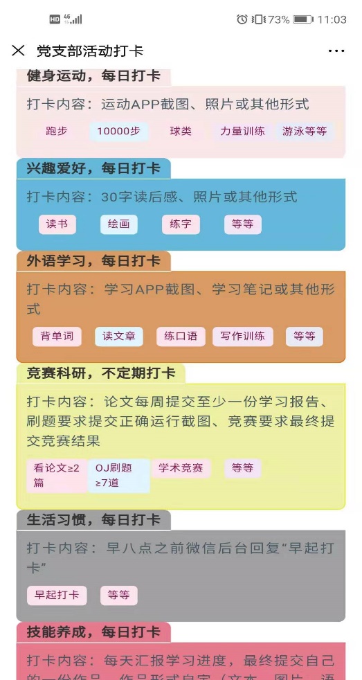 打卡内容由参与学生自主选择,分为:健身运动、兴趣爱好、外语学习、竞赛科研、生活习惯、技能养成6个大类。经过后期统计后发现,参与者大多选择健身运动、外语学习、生活习惯三个大类。从中可以看出当代研究生,在学习的同时,关注个人的健康,白天的学习后通过跑步来锻炼身体以及释放压力的不在少数。而且虽然研究生在研一以后就已经没有了固定课程,但是仍然有不少同学十分的自律,能够做到在8点以前早起,精神饱满的迎接一天的科研生活。在科研中,同学们常常需要阅读英文文献,提高自身的英语水平,也是当代研究生顺应时代发展、学习新知识的迫切需要。本次活动最终在每个大类中选取部分完成度较高的优秀党员评出一二三等奖项,以资鼓励。