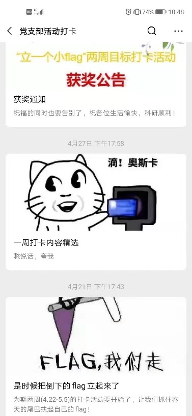 为了培养大家悦纳自己、关爱自己、积极面对生活的心态,由应用二支部主办的庆祝建国70周年系列党日活动之“立一个小flag”两周目标打卡活动于2019年4月22日正式开始。在打卡期间,参与成员首先选择一个打卡目标的大类别,两周内完成一项内容,需要在微信公众号后台发送每一天的进度,图片或者文字说明。