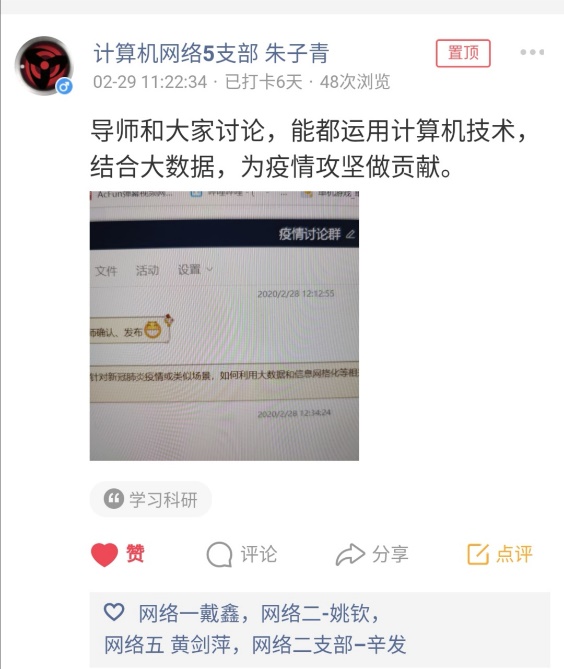 计算机学院研究生各党支部于2月24日发起了“SEU计算机学院研究生党日活动”线上打卡活动,以倡导广大研究生党员同学居家进行学习科研等活动,养成良好的生活习惯,分享每日生活中的小快乐。