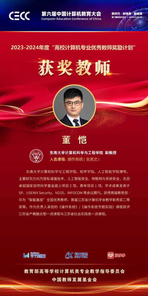 喜报!东南大学香港特码王 董恺副教授入选2023-2024年度高校计算机专业优秀教师奖励计划